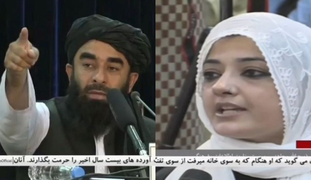 Il portavoce talebano e la giornalista Sumaira Khan in conferenza stampa. Foto Twitter @MalikAliiRaza