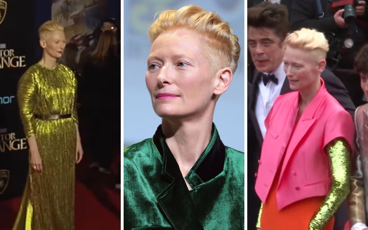 Ai Golden Globe del 2012, ha invece optato per un abito color carta da zucchero aderente di Haider Ackermann. L’anno precedente ha sfoggiato un completo composto da camicia bianca e gonna color burro di Jil Sander. Tilda Swinton ha spesso partecipato al Festival di Cannes: per l’edizione 2017 ha indossato un completo jumpsuit total black rivestito di paillettes di Chanel. E sempre di Chanel è l’abito bianco con ricami floreali in pizzo indossato a Venezia 2020. All’edizione 2021 di Cannes l’attrice ha calcato il red carpet con un completo vistoso di Haider Ackermann, composto da una gonna a vita alta arancione, blazer a maniche corte e top in raso rosa e maniche rivestite di paillettes verde.