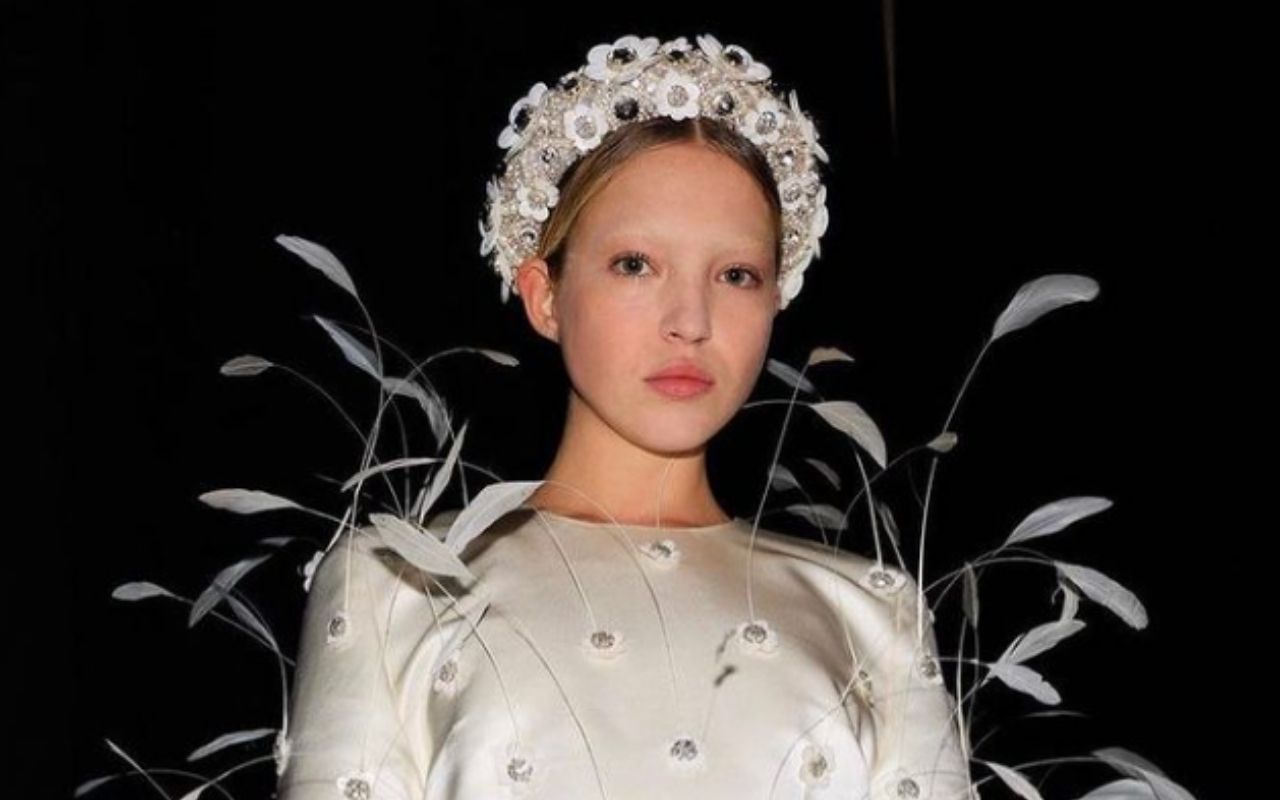 A catturare l’attenzione è anche il beauty look della modella. Il copricapo, rigorosamente total white, è tempestato di fiori in rilievo e richiama il ricco bouquet che la modella regge tra le mani in passerella. E, lato make-up, Lila Moss ha proposto un nuovo trend, quello delle sopracciglia schiarite rese quasi trasparenti.