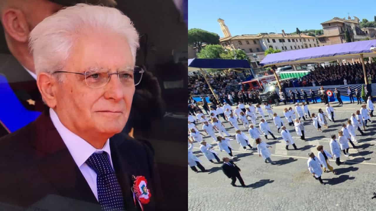 Sergio Mattarella osserva sfilare i medici che hanno lottato contro il Covid alla parata per la Festa della Repubblica