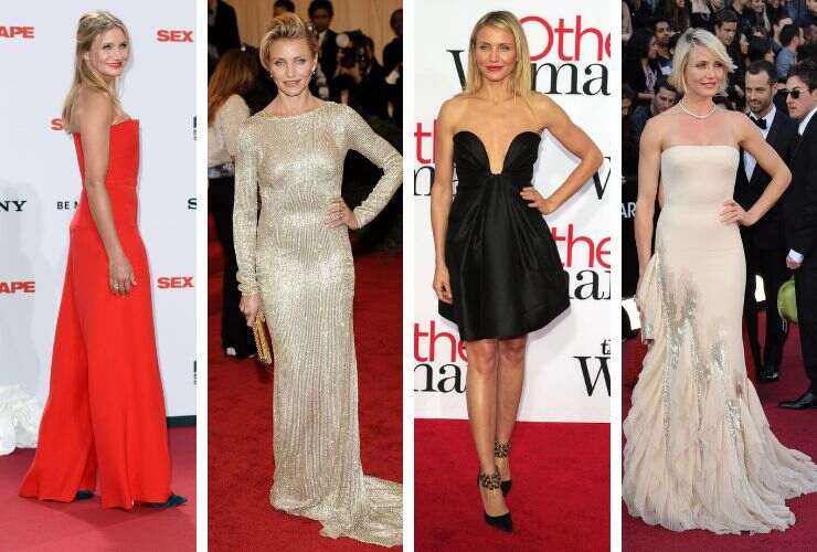 Alla première berlinese di Sex Tape – Finiti in rete, nel 2014, l’attrice ha sfoggiato un completo jumpsuit rosso senza spalline sul red carpet di Christian Dior. E della maison sono anche le décolleté. Sul red carpet di Tutte contro lui – The Other Woman, quell’anno, ha proposto un minidress nero in raso con scollatura dal taglio asimmetrico di Stella McCartney, a cui ha abbinato décolleté a punta in velluto con cinturino rivestito di borchie d’oro. Sul tappeto rosso del Met Gala 2012, ha proposto un’altra creazione della stilista britannica: un long dress champagne rivestito di paillettes con scollo lato schiena. Quell’anno Cameron Diaz è apparsa anche agli Oscar e, per l’occasione, ha scelto un abito nude senza spalline e con gonna drappeggiata di Gucci.