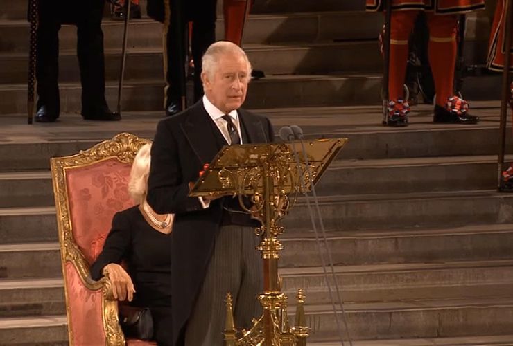 Rendendo omaggio alla regina Elisabetta, Carlo ha detto: “Hai dato l’esempio del dovere disinteressato che, con l’aiuto di Dio e i tuoi consigli, sono deciso a seguire fedelmente”. Dopo il discorso sembrava visibilmente commosso mentre per la prima volta veniva cantato l’inno nella versione al maschile: God Save the King. Nel pomeriggio ha accompagnato il feretro della madre in compagnia dei fratelli.