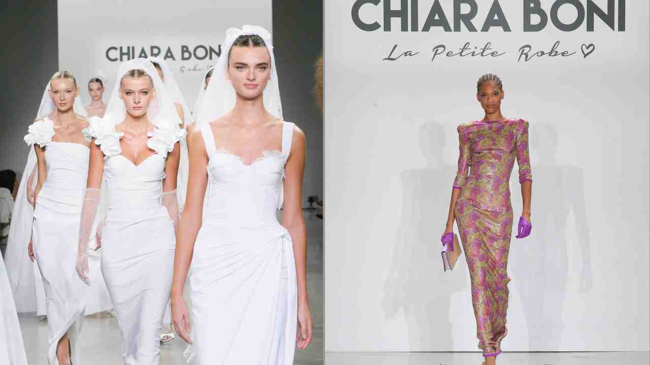 Micro e macro stampe floreali sono state proposte in una palette di colori caleidoscopica che spazia dalle tonalità più tenui e discrete del bianco crema e delle sfumature sorbetto, tra cui pera, tuberosa e lavanda, fino ad accenti di turchese e nero. Fiori romantici dall’atmosfera sognante sono sbocciati sui maxi e mini abiti in jersey di Chiara Boni La Petite Robe_SS23. Ricami allover di paillettes hanno arricchito i modelli da cocktail, disegnati per brillare nella notte, decorati da applicazioni metalliche che evocano le impunture a contrasto. Il party vibe della collezione, sottolineato dagli accessori, tra cui guanti super chic e raffinati cappelli, è stato esaltato anche dagli accattivanti abiti in lurex, nonché dai modelli drappeggiati realizzati in un tessuto fluido leggero con un affascinante effetto spalmato. Una parata di spose dall’eleganza impeccabile ma sempre smart, ha chiuso lo show con una nota romantica e gioiosa.