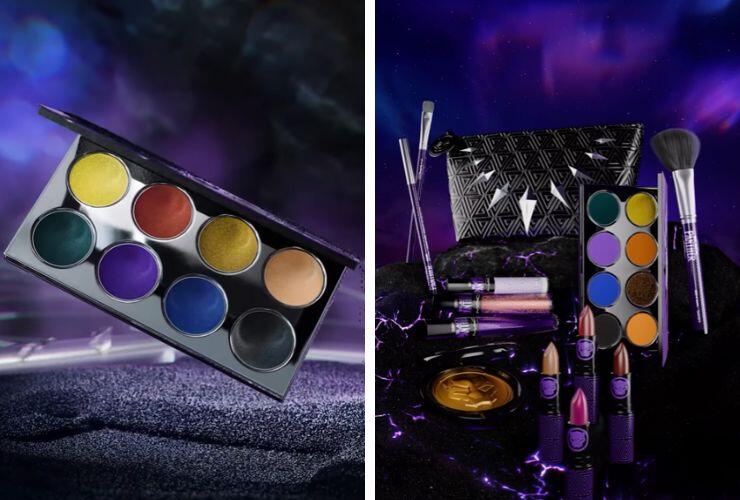 La capsule collection in edizione limitata è composta da 18 pezzi e spazia tra rossetti, lucidalabbra, eyeliner, palette di ombretti e pennelli, fino ad una pochette per contenere tutti i prodotti beauty. La palette presenta sfumature vibranti che ricordano tonalità gioiello, con finiture opache e metalli scintillanti. Anche i colori ricordano le atmosfere del Wakanda e della pellicola, dall’arancione vitaminico al blu elettrico, dal verde smeraldo al color bronzo. Gli ombretti sono cremosi e racchiusi in un packaging da collezione. Anche per i rossetti, il brand ha scelto accuratamente colori e nomi: ad esempio troviamo il Wakandan Sunset, di un fucsia brillante dai toni freddi. O ancora un blu-rosso opaco che risponde a Dora Milaje e il Royal Integrity che sarebbe un marrone tendente al cioccolato. E non può mancare la sfumatura Wakanda Forever, di un viola brillante.