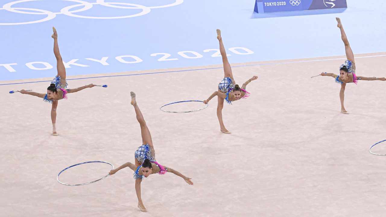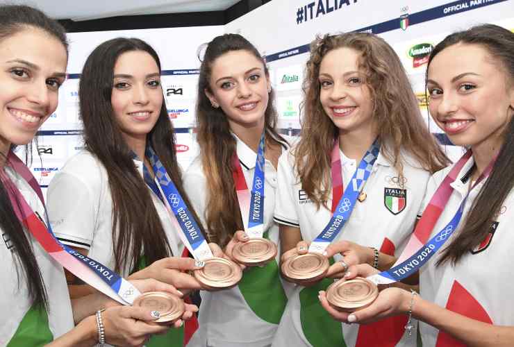 Le “farfalle” di ginnastica ritmica festeggiano la loro medaglia di bronzo alle olimpiadi di Tokyo. Foto Ansa/Ciro Fusco