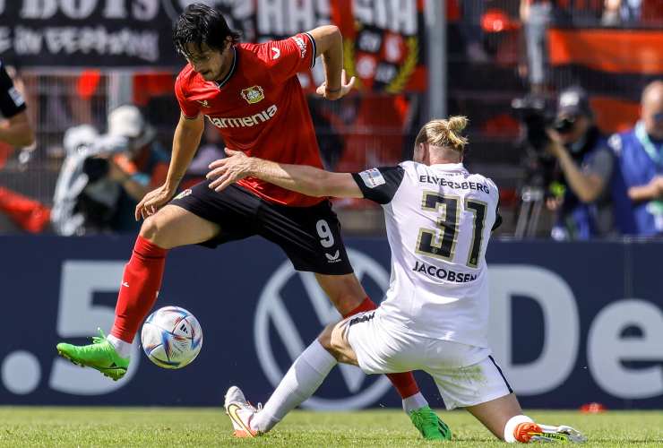 Sardar Azmoun, a sinistra, in azione per il Bayer Leverkusen. Foto Ansa/Epa Ronald WitteK