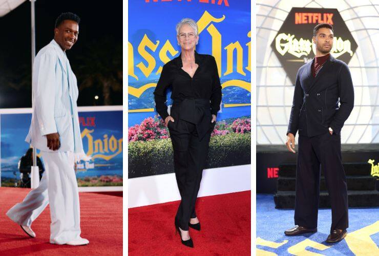 Sul red carpet spazio anche a Jamie Lee Curtis apparsa nel cast del primo Knives Out – Cena con delitto. Alla première del sequel propone la sua eleganza evergreen con un completo pantaloni e camicia total black. Anche Regé-Jean Page ha raggiunto il tappeto rosso in un competo a costine grigio fumo e dolcevita bordeaux. Infine Leslie Odom Jr. ha sfoggiato un completo oversize dalle sfumature pastello.
