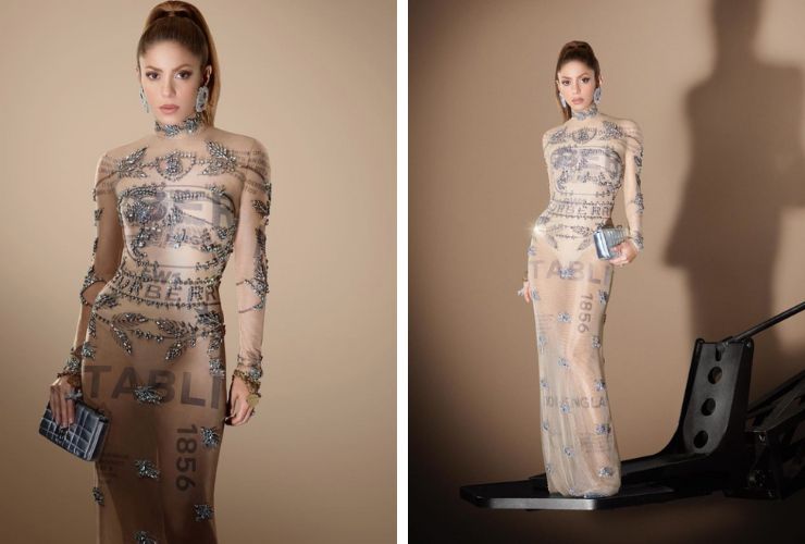 Il primo punta alla luminosità. La cantante rincorre le tendenze del 2022 indossando un abito che gioca con le trasparenze, effetto nude, ma rivestito dal logo della maison ben distinguibile in argento e ravvivato da cristalli e decorazioni floreali. L’abito in tulle (modello naked dress) è stato già indossato in precedenza da Lila Moss, figlia di Kate Moss che ha ereditato dalla madre bellezza e portamento in passerella. In una sorta di mondo immaginario che ricorda La bella e la bestia, Shakira ha poi sfilato su tavoli arricchiti da argenteria indossando un completo con stampa nova check per gonna a vita alta e cuissardes, risultando estremamente glamour.