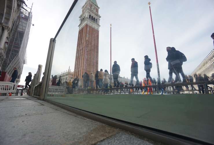 Una panoramica sulle barriere in vetro poste a difesa della basilica di San Marco dalle acque medio alte, con lo strano effetto acquaio causato dall’acqua visibile dalla parte opposta della barriera, che allaga il selciato di piazza San Marco, il19 novembre 2022. Foto Ansa/Andrea Merola