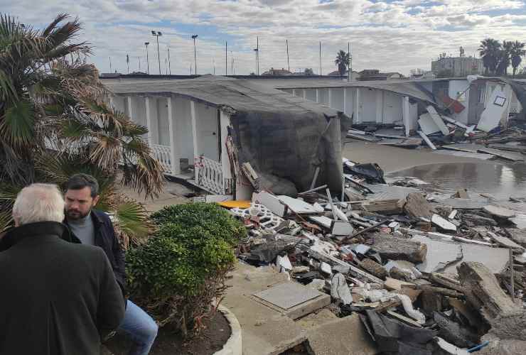 Sopralluogo del sindaco di Fiumicino, Esterino Montino, sulla costa sud di Fregene (Roma) dopo i danni della mareggiata, il 24 novembre 2022. Foto Ansa/Telenews