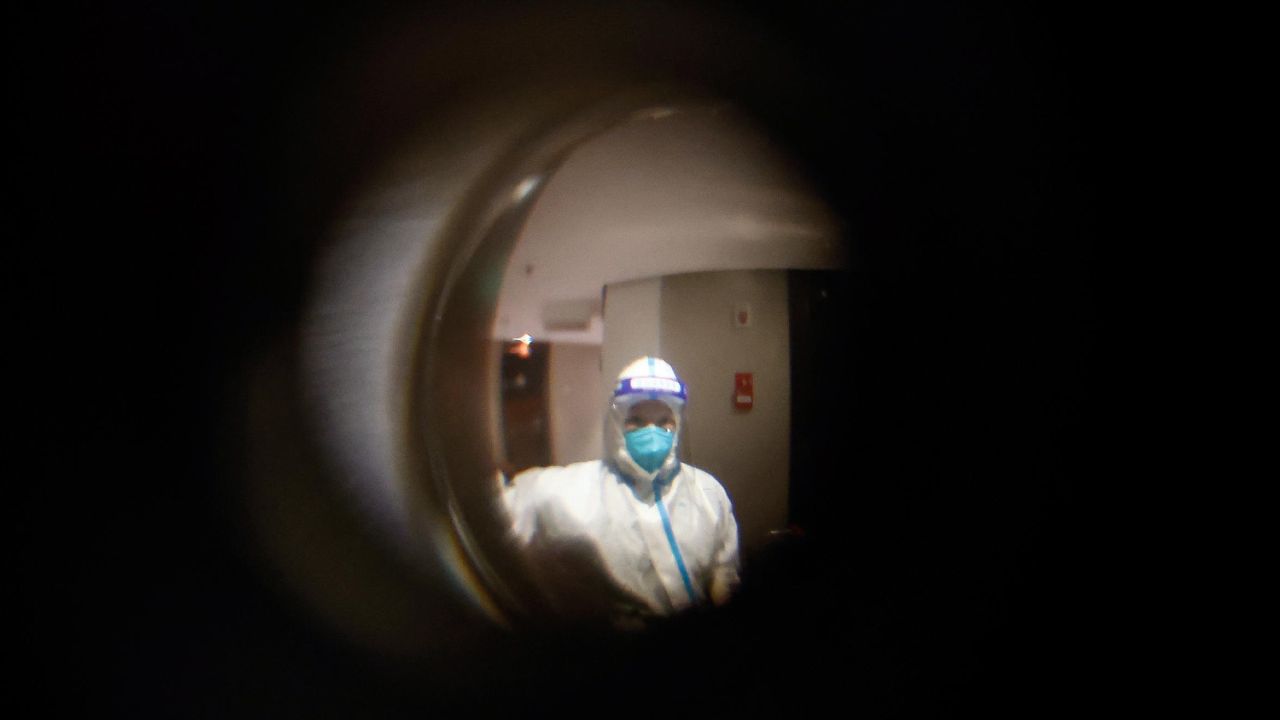 Un impiegato in tuta protettiva viene visto attraverso uno spioncino in un hotel di quarantena per passeggeri a Xiamen, provincia del Fujian, Cina, 22 dicembre 2022. Foto Ansa/Epa Mark. R. Cristino