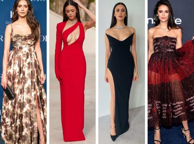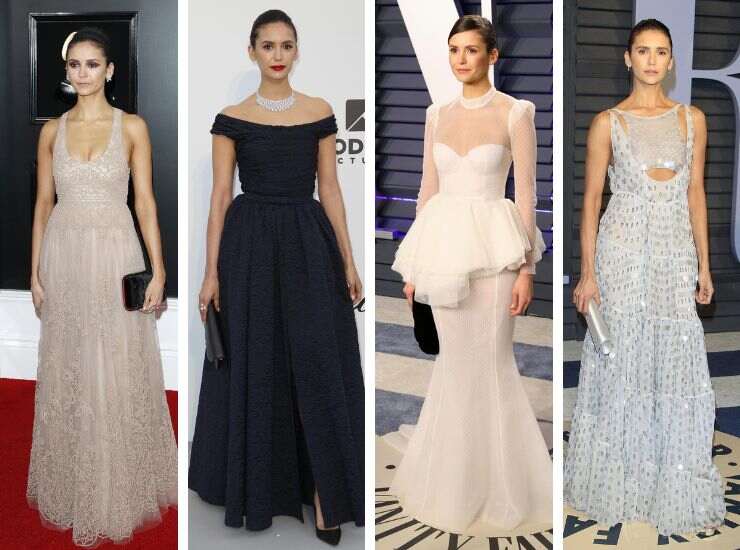 Blu Royal è l’abito indossato dall’attrice in occasione dell’amfAR Gala organizzato durante il Festival di Cannes 2019. L’abito propone scollo a barchetta e spacco centrale della gonna e porta la firma di Christian Dior, collezione Autunno 2019. Ai Vanity Fair Oscar Party dello stesso anno, Nina Dobrev ha optato per un abito bianco panna con tulle e pois di Brock Collection. Allo stesso evento, ma nel 2018, ha proposto una creazione d’argento con maxi pois in rilievo effetto specchio di maison Valentino. Ai Grammy Awards 2019, ha scelto un abito rosa cipria con ricami floreali in rilievo di Dior, a cui ha abbinato clutch nera in velluto e gioielli Harry Winston.