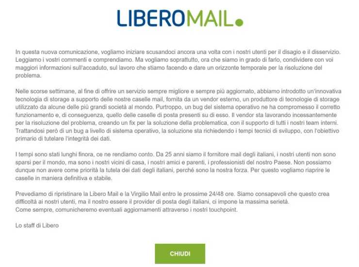 Dal 23 gennaio i servizi di posta elettronica di Libero e di Virgilio sono in down