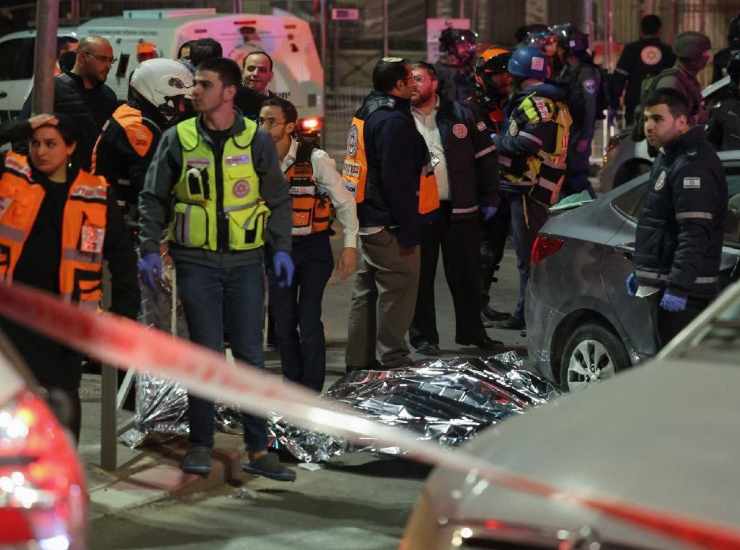 Soccorritori e forze di polizia accanto al cadavere di una delle vittime dell’attacco a Gerusalemme del 27 gennaio. Foto Twitter @LTCPeterLerner