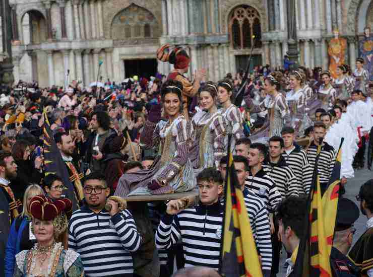 Un’edizione passata del Carnevale di Venezia con le giovani Marie che salutano la folla in Piazza San Marco. Foto Ansa/Andrea Merola
