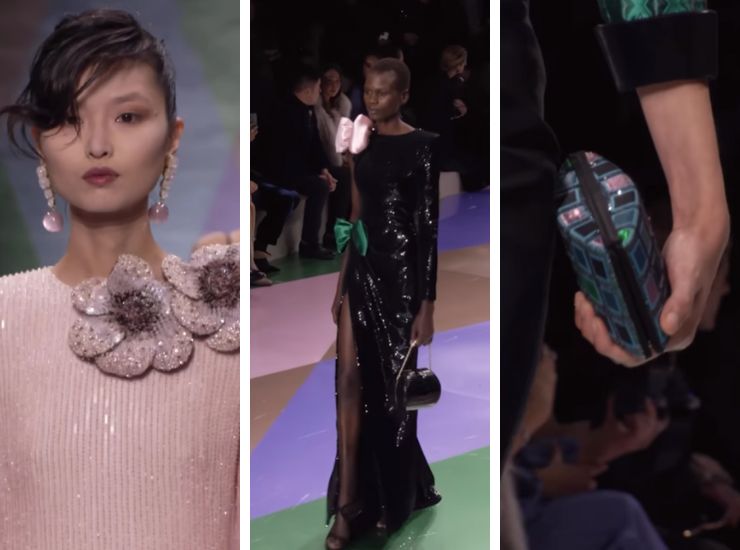 Della sua Inferno Couture risaltano soprattutto le Face Bag della maison, proposte in ogni dimensione e colori. Preziosa è la bag intarsiata con foglie d’oro 24 carati pattern tartarugato. Ed è sempre il motivo viso il tema predominante degli accessori Schiaparelli, dagli orecchini alle finte teste di animali che accompagnano la silhouette come accessorio Haute Couture. Ma Schiaparelli non è l’unica maison ad aver proposto i suoi accessori indispensabili per prossima stagione.
