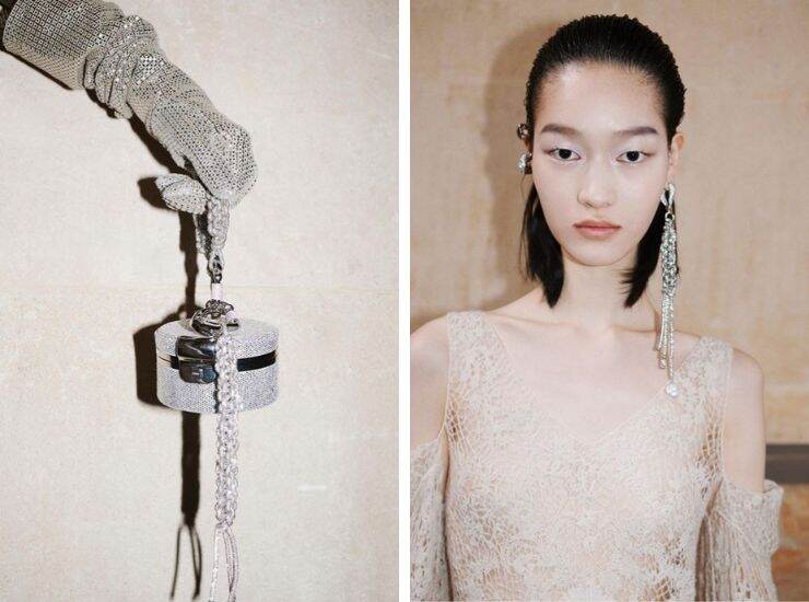 Guanti chic effetto metallizzato sparkling sono quelli invece sfoggiati da Fendi in passerella. Tra gli accessori Haute Couture più glam brilla (letteralmente) la clutch bauletto con dettagli gioiello e catena. La stessa poi proposta come orecchini. La collezione punta ad una palette delicata, con motivi plissé e pizzo in abbondanza che fascia la silhouette.
