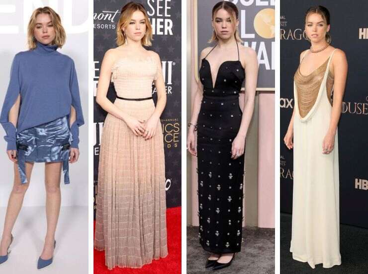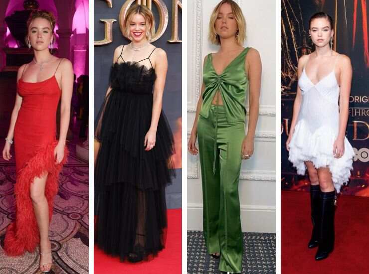 Per il suo red carpet, l’attrice di House of the Dragon ha proposto un abito rosa cipria degradé, con gonna a micro balze e corpetto plissé accompagnato da delicate rouches ad altezza scollatura. L’abito indossato fa parte della collezione Haute Couture Dior Primavera/Estate 2019. In aggiunta ha proposto gioielli Pomellato. Poco prima è apparsa ai Golden Globes dividendo la scena con la sua controparte più adulta, Emma D’Arcy. Sul tappeto rosso ha proposto un tubino total black di Givenchy, collezione Autunno 2023, tempestato di strass e accompagnato ancora una volta da gioielli Pomellato. Alla première mondiale di House of the Dragon, ha sfoggiato un abito total white con corpetto sfrangiato in oro di Alexander McQueen.