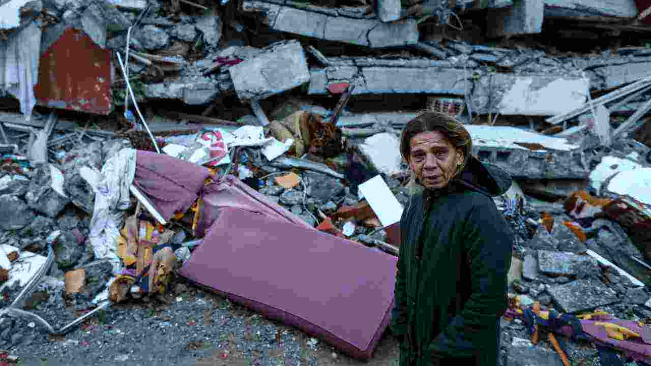 Una donna davanti a un edificio crollato dopo a Iskenderun (Alessandretta), in Turchia. Foto Ansa/Epa Erdem Sahin