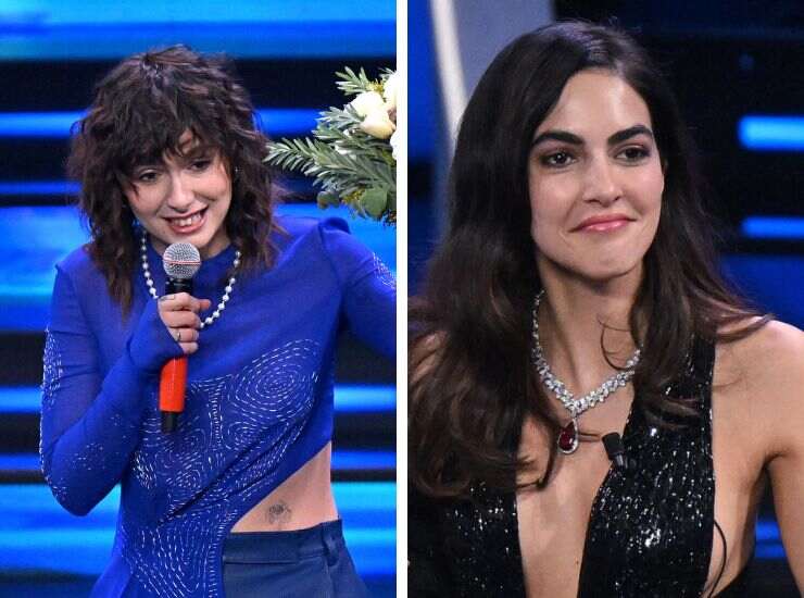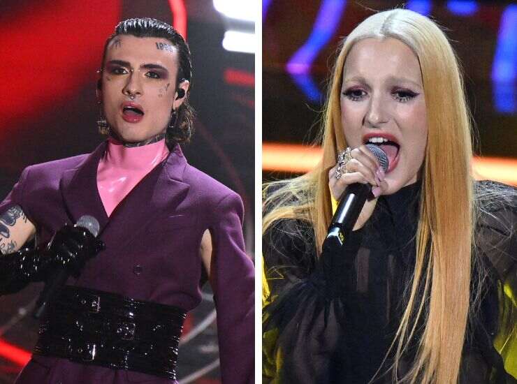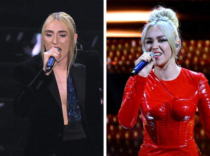 Per Shari uno chignon alto, intrecciato, che lascia due ciuffi ben delineati liberi di sfiorare le guance. Lato make-up, la cantante ha evidenziato lo sguardo con un marcato cat-eye. Anche Mara Sattei ha raccolto i capelli in uno chignon basso effetto messy con ciuffi laterali. Sul fronte make-up, ha optato per un effetto glitter che avvolge lo sguardo e richiama l’abito.