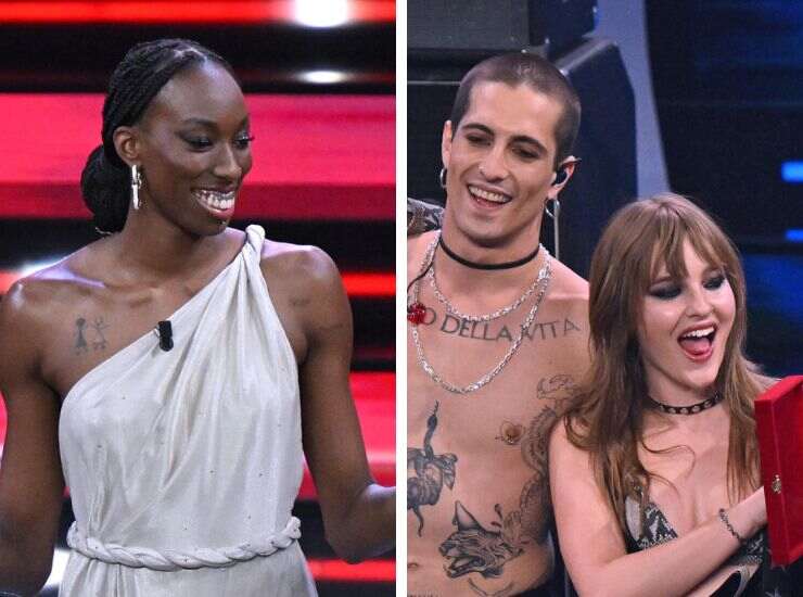 Paola Egonu ha ravvivato il make-up con un tocco sparkling dettato dall’aggiunta di micro strass adagiati sulla palpebra e che delineano ancor di più lo sguardo, segnato da un leggero smokey eye e matita nera sfumata. La sportiva ha scelto di presentarsi sull’Ariston con un maxi raccolto basso, ma nel corso della serata ha sciolto i capelli proponendo una coda bassa. I Maneskin di ritorno a Sanremo dopo la vittoria dell’edizione 2021 hanno ravvivato il proprio fascino glam. Damiano David ha rilanciato il buzz cut, mentre Victoria ancora una volta piace con la sua frangia a tendina.