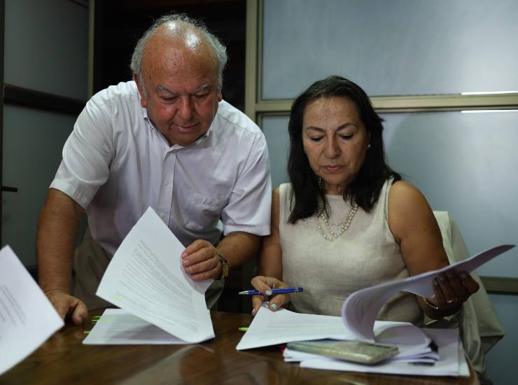 Rodolfo Reyes (a sinistra), avvocato e nipote di Pablo Neruda, insieme a Elizabeth Flores, avvocata nel caso Neruda. Foto Ansa/Epa