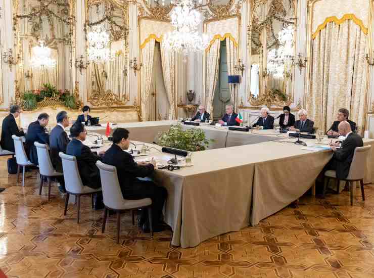 Quirinale: la delegazione italiana, guidata da Sergio Mattarella, con quella cinese, guidata da Wang Yi. Foto Twitter @Quirinale