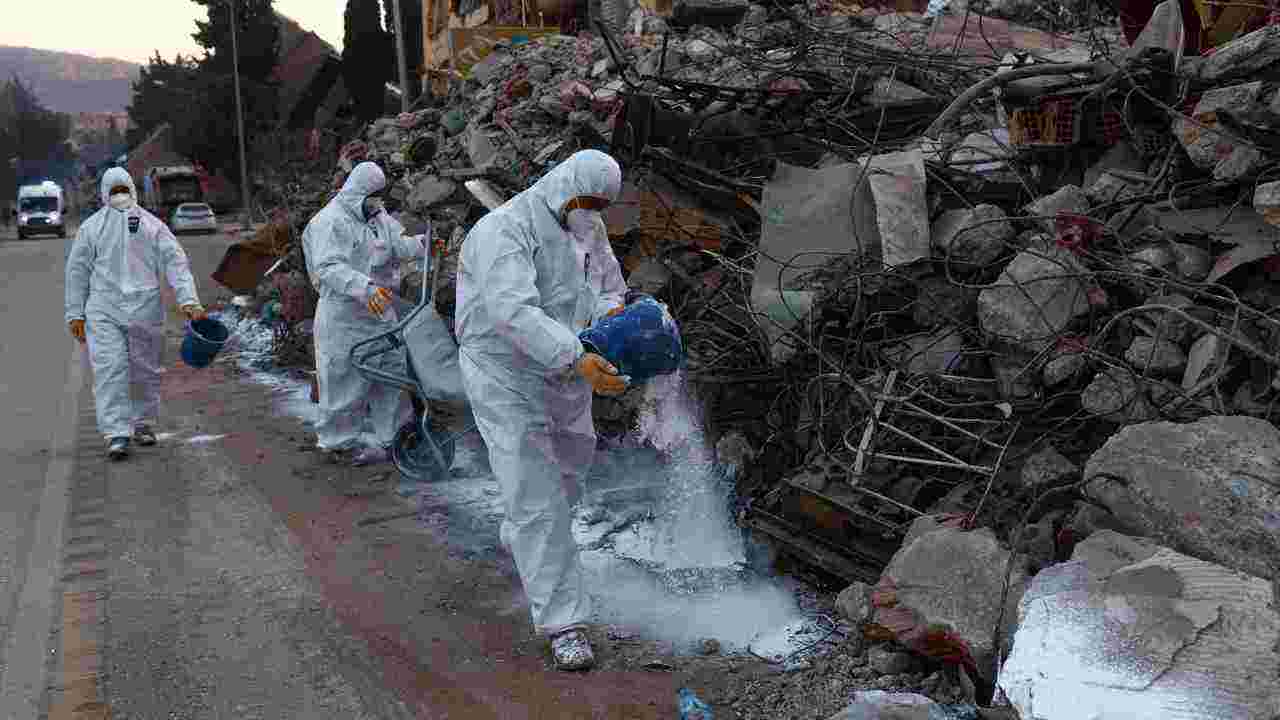 Soldati turchi versano calce sulle macerie del terremoto ad Hatay, in Turchia, per prevenire infezioni e malattie. Foto Ansa/Epa Sedat Suna