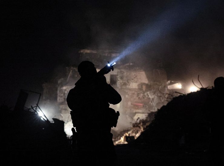 Un soldato delle forze speciali turche pattuglia la strada contro i saccheggiatori ad Hatay, in Turchia, dopo il terremoto del 6 febbraio 2023. Foto Ansa/Epa Sedat Suna
