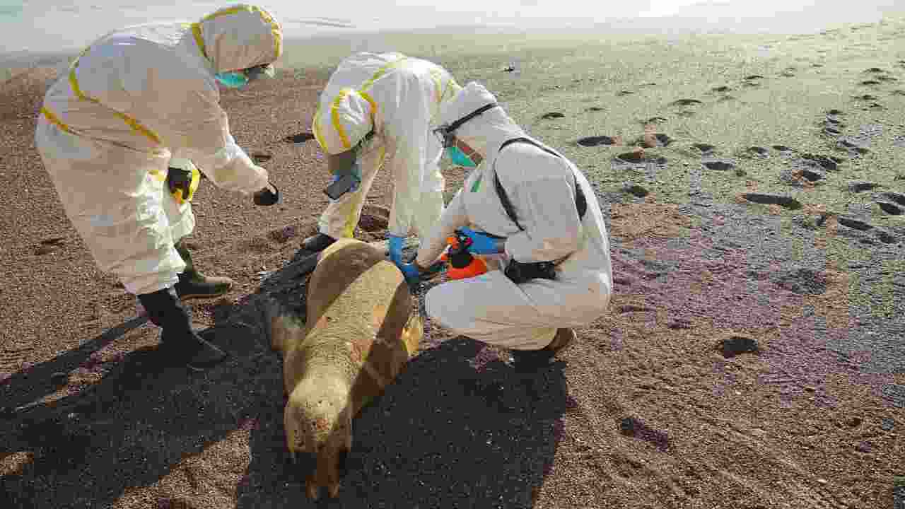 Operatori del National Forestry and Wildlife Service (Serfor) del Perù esaminano un leone marino morto su una spiaggia peruviana, il 15 febbraio 2023. Foto Ansa/Epa Serfor Perú