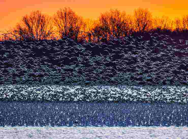 Uno stormo di oche delle nevi decolla dalla Middle Creek Wildlife Management Area vicino a Kleinfeltersville, Pennsylvania, Usa. Un nuovo ceppo del virus dell’influenza aviaria H5N1 si sta diffondendo attraverso stormi di oche delle nevi negli Stati Uniti. Foto Ansa/Epa Jim Lo Scalzo