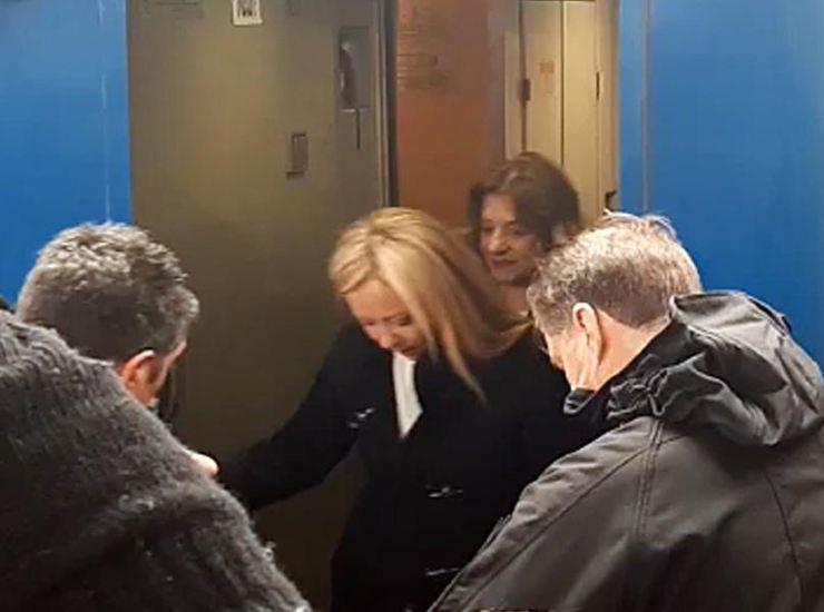 Giorgia Meloni scende dal treno a Kiev, giunta dopo un viaggio notturno dalla Polonia, il 21 febbraio 2023. Foto Ansa
