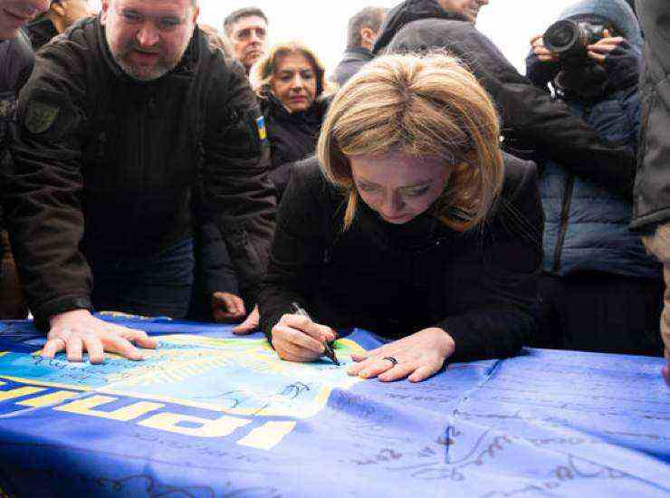 La premier Meloni firma una bandiera ucraina nel giorno della sua visita a Irpin e a Bucha, sobborghi di Kiev in cui nel 2022 gli occupanti russi hanno fatto strage di civili inermi. Foto Ansa