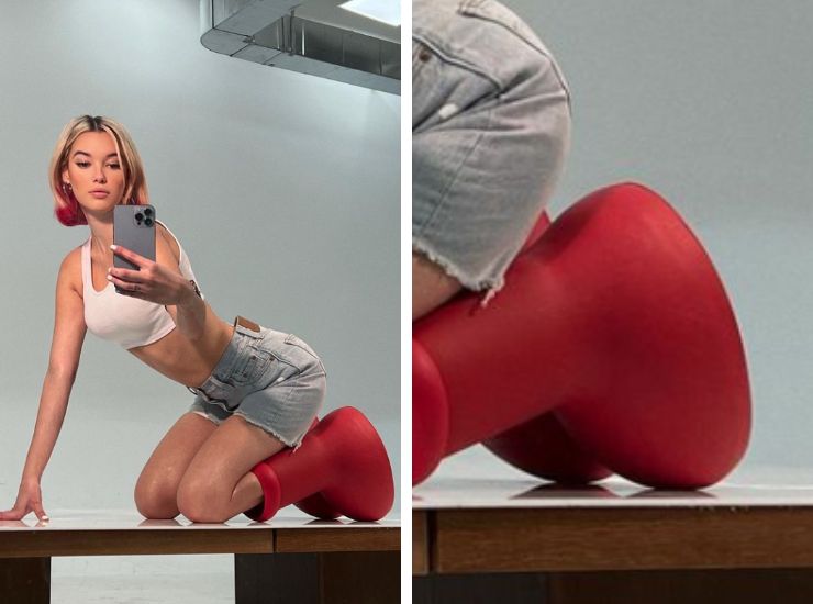 Il prezzo di vendita al momento del lancio è di 350 dollari, ma essendo già sold out sono disponibili con un’offerta che parte da 1400 dollari su StockX. Una vera e propria ossessione è quella che si è scatenata nei confronti dei Big Red Boots di MSCHF, brand newyorkese fondato da Gabriel Whaley. E dimostra su cosa verte l’interesse del web ad oggi. Molti sono i brand che negli anni hanno osato, realizzando abbigliamento e accessori stravaganti. Ricordate, ad esempio, le Minnie Mouse decollette di Loewe? Oppure Balenciaga che ha unito le forze con Crocs? Così come Prada, che non molto tempo fa ha realizzato mocassini a forma di palloncino in perfetto stile cartone animato. L’esperimento di Gabriel Whaley, in questo senso, è ben riuscito.