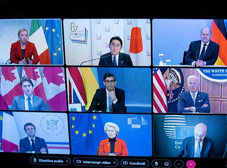 La premier Giorgia Meloni (in alto a sinistra) durante il meeting virtuale tra Joe Biden, i leader del G7 e il presidente ucraino Volodymyr Zelensky, il 24 febbraio 2023. Foto Ansa/Palazzo Chigi/Filippo Attili