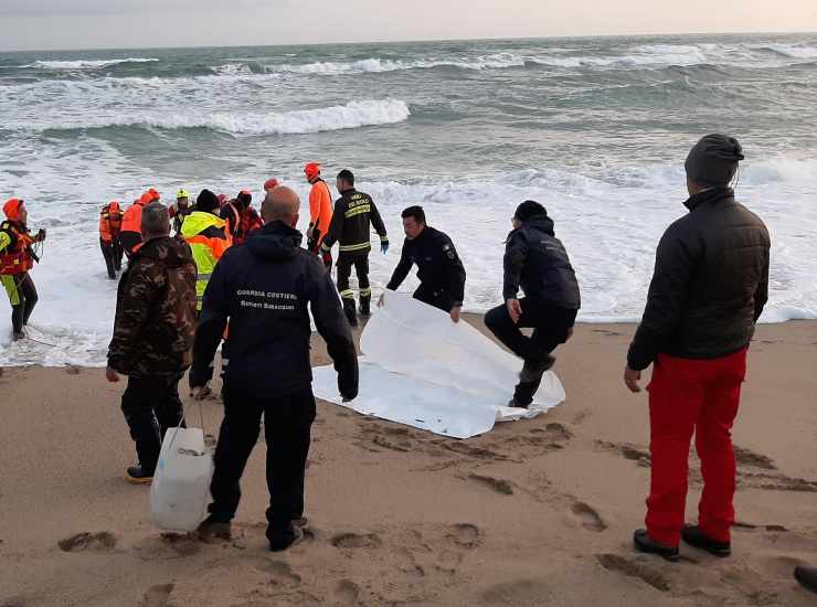 Il recupero di un cadavere nel corso delle ricerche dei dispersi del naufragio di migranti del 26 febbraio 2023 a Cutro (Crotone). Foto Ansa/Alessandro Sgherri