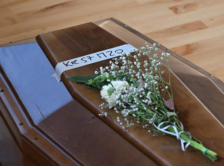 Una bara senza nome alla camera ardente dei naufraghi morti, presso il palazzetto dello sport di Crotone. Sul nastro una sigla di riconoscimento che comincia con “Kr” che sta per “Crotone”, luogo della tragedia. Foto Ansa/Carmelo Imbesi