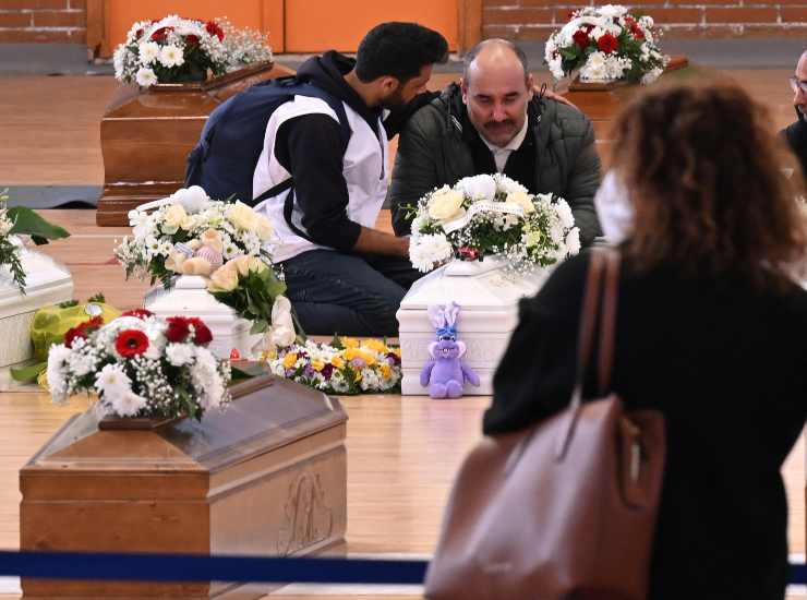 La camera ardente delle vittime del naufragio del 26 febbraio al Palasport di Crotone. Si vedono superstiti in lutto vicino alle bare bianche dei loro bambini. Foto Ansa/Carmelo Imbesi