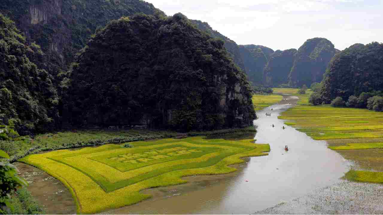Risaie lungo il fiume Ngo Dong a Tam Coc, una parte della catena montuosa calcarea di Hoa Lu, a circa 120 km da Hanoi, capitale del Vietnam. Foto Ansa/Epa Luong Thai Linh