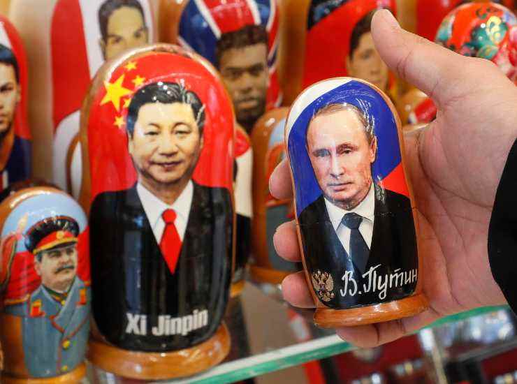 Un uomo esamina le bambole matrioska con i ritratti di Putin e di Xi Jinping (a sinistra Stalin) in un negozio di Mosca. Foto Ansa/Epa Yuri Kochetkov