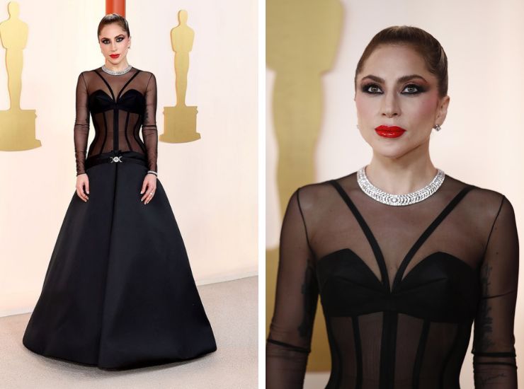 Lady Gaga è molto legata alla maison italiana e non avrebbe potuto effettuare scelta migliore per la notte degli Oscar 2023. Il long dress condiviso da Lady Gaga e Gigi Hadid propone una gonna a vita rigorosamente bassa, in raso nero, arricchita da una cintura che riporta il logo Medusa tanto caro a Versace. A completare l’abito un corpetto di chiffon total black che gioca con le trasparenze. L’unica, grande differenza è l’accessorio luminoso scelto per l’occasione. Gigi Hadid in passerella l’ha abbinato ad un collier di maxi perle, mentre Lady Gaga per gli Oscar ha scelto un collier di diamanti più fine di Tiffany&Co, un modello d’archivio degli Anni ’50, a favore della sostenibilità.