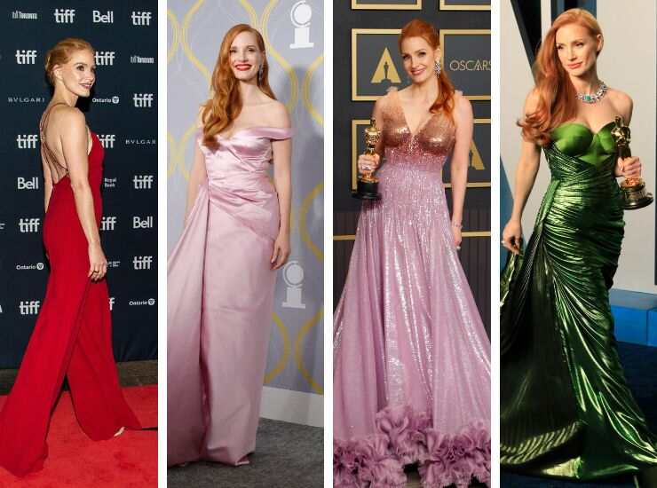 Al Toronto Film Festival 2022, invece, ha scelto un completo jumpsuit total red di Elie Saab, collezione Resort 2023. Ai Tony Awards 2022, invece, ha scelto un abito confetto in raso di Gucci. Grande trionfo agli Oscar. Jessica Chastain ha indossato un abito Gucci bicolore sul red carpet degli Academy Awards 2022 rivestito di paillettes. Per i Vanity Fair Oscar Party, poco dopo, invece ha scelto un long dress smerando della maison.