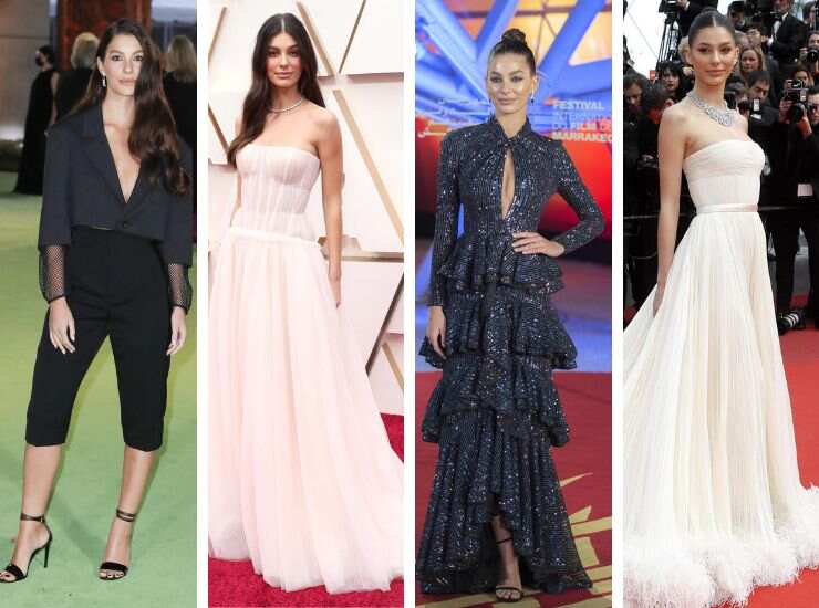 Sul red carpet insieme al resto delle co-star della serie TV, Camila Morrone ha optato per un abito total black con mantella in chiffon ton sur ton della maison. Fa parte della collezione Pre-Fall 2023. Ai Vanity Fair Oscar Party del 2022, invece, ha sfoggiato una creazione di Alexandre Vauthier. L’abito con dettagli cut out è rivestito di paillettes d’argento effetto specchio e fa parte della collezione Haute Couture Primavera/Estate 2022. In aggiunta, ha proposto décolleté effetto specchio di Jimmy Choo. Sul red carpet dei LACMA Art + Film Gala 2021, invece, ha giocato con le trasparenze di un abito total black in chiffon di Atelier Versace. Il long dress con drappeggi delicati e strass all over avvolge la silhouette e fa parte della collezione Autunno/Inverno 2020.