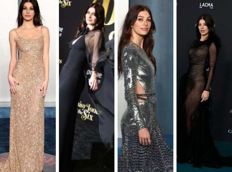 Nonostante la sua carriera d’attrice sia ancora agli inizi, Camila Morrone è una fashion icon. Essendo ben inserita nel mondo della moda anche come modella, finora non ha mai deluso le aspettative sul red carpet. L’ultima volta che ha sfilato sul tappeto rosso è stato in occasione dei Vanity Fair Oscar Party. Per l’edizione 2023, l’attrice ha scelto un abito rigorosamente luccicante, effetto nude ma completamente rivestito di paillettes in oro, con scollatura vertiginosa lato schiena. L’abito è firmato Valentino e fa parte della collezione Primavera/Estate 2023. A curare il suo look la stylist Sandra Amador. La modella pare essere affezionata alla maison italiana: infatti è ancora una volta Valentino l’abito total black indossato alla première di Los Angeles di Daisy Jones and The Six.
