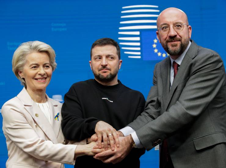 President of the European Commission Ursula von der Leyen, Ukraine’s President Volodymyr Zelensky and President of the European Council Charles Michel pose for a photo during a joint press conference on the sidelines of a special meeting of the European Council in Brussels, Belgium, 09 February 2023. Photo Credits: @Ansa – EPA/OLIVIER HOSLET