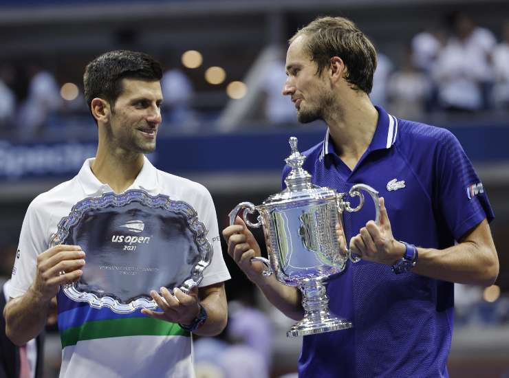 Complice la suggestione dei filmati di raffronto con Nole che hanno imperversato sui social nel pre-match, la finale del Miami Open è stata quello che ci aspettavamo: un po’ Djokovic contro il suo doppio. Già perché come Daniil Medvedev ha dimostrato ampiamente in quella modalità è devastante. Rivedere la finale dello US Open 2021 (foto sotto) per credere: ha battuto Nole con e al suo gioco. Devastante magari un filino meno dell’originale, ma sempre estremamente efficace. In quella “storica” partita ha strappato in un sol colpo il sogno del Grande Slam e la prima posizione nella classifica mondiale, proprio all’amico sul circuito e un po’ maestro da seguire.