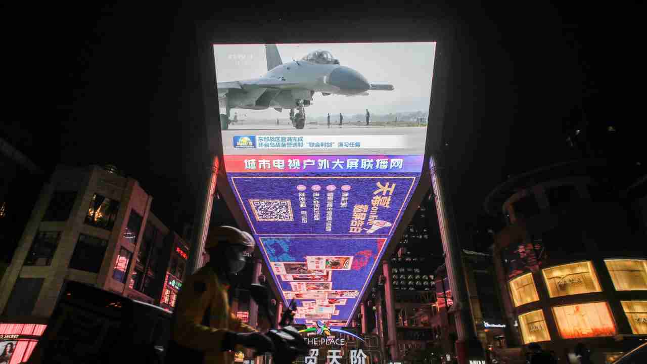 Aerei da guerra nelle esercitazioni contro Taiwan sui maxischermi cinesi. Foto Ansa/Epa Wu Hao