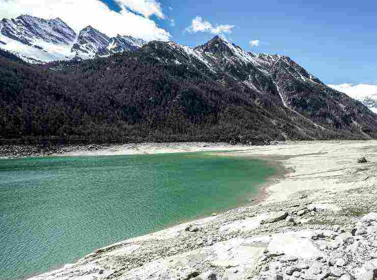 La situazione del lago di Ceresole Reale, in provincia di Torino: un tempo coperto di neve fino a metà aprile, oggi privo di neve e asciutto in larga parte. Foto Ansa/Jessica Pasqualon