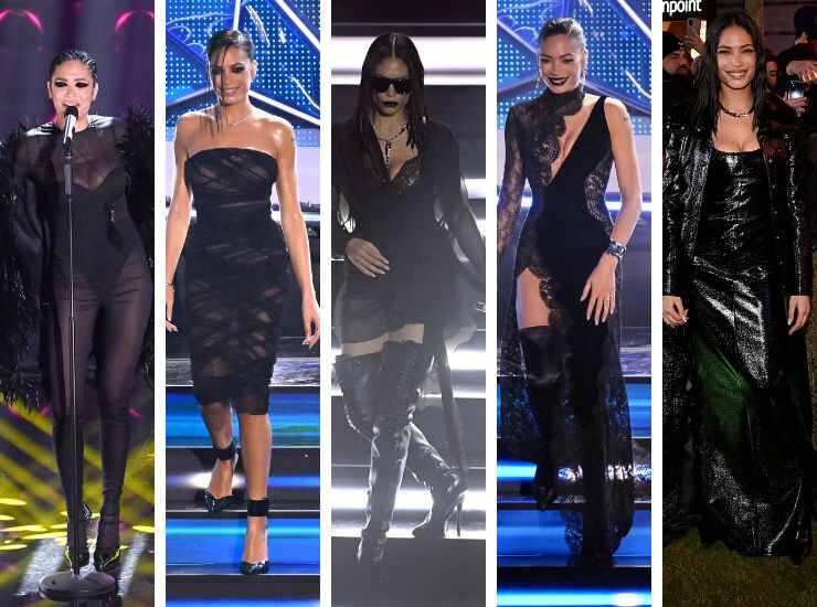 Soltanto pochi mesi fa, Elodie ha riportato tutto il suo fascino glam sul palco dell’Ariston, questa volta impreziosendo ogni serata con un look total black che ha aiutato a diffondere sempre più il trend ritrovato del gothic look, tanto caro a Jenna Ortega. Per l’edizione 2023 del Festival di Sanremo, Elodie ha calcato il palcoscenico dell’Ariston indossando diversi abiti total black e firmati da diverse maison. Ad esempio, la prima serata di Festival di Elodie porta la firma di Valentino Haute Couture, con un completo jumpsuit in chiffon total black, accompagnato da una mantella di piume. Il ritorno all’Ariston, poco dopo, è invece firmato The Attico: si tratta di un tubino in chiffon che gioca con le trasparenze.
