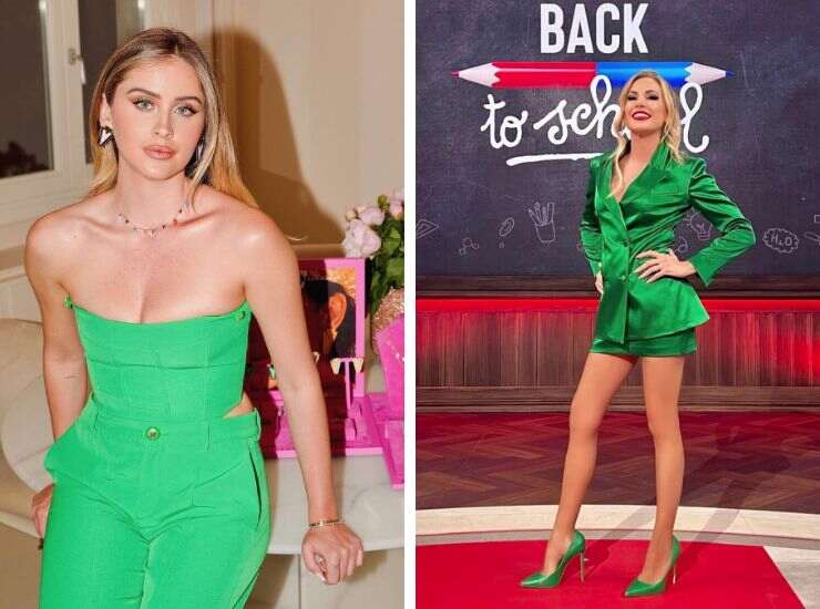 Più che neon, tende allo smeraldo il completo indossato da Valentina Ferragni. L’imprenditrice ha scelto pantaloni a vita bassa e top senza spalline dal taglio geometrico che fanno parte del brand Chiara Ferragni. Ed è ancora verde, ma scintillante, il blazer dress proposto da Federica Panicucci per Back to school. La conduttrice in questo caso ha incluso due tendenze in una (considerando che il blazer dress è a sua volta gettonatissimo, anche sul red carpet).